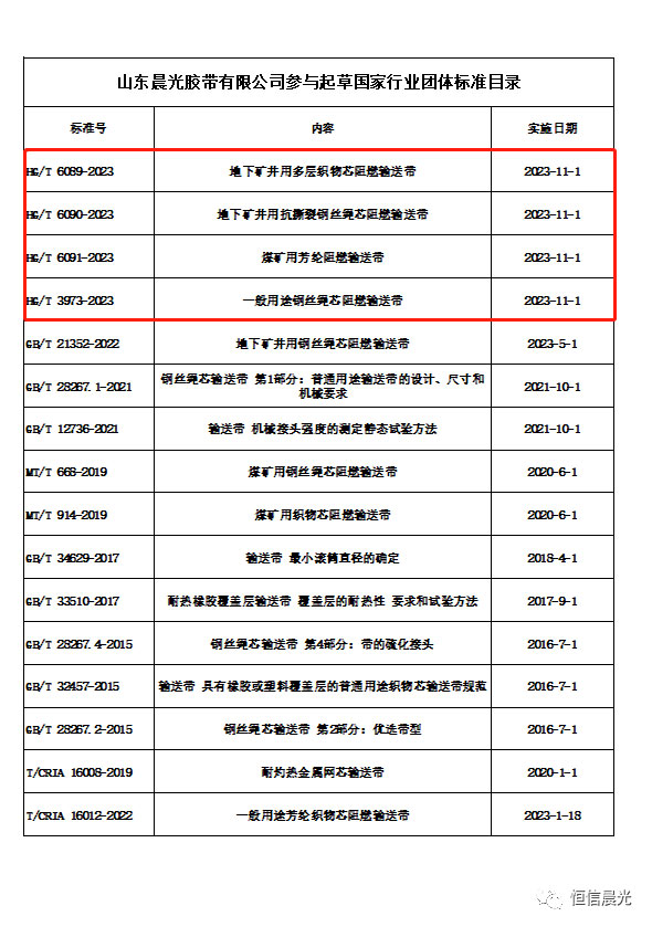 由我公司參與起草的HG/T 6089-2023《地下礦井用多層織物芯阻燃輸送帶》、HG/T 6090-2023《地下礦井用防撕裂鋼絲繩芯阻燃輸送帶》、HG/T 6091-2023《煤礦用芳綸阻燃輸送帶》、HG/T 3973-2023《一般用途鋼絲繩芯阻燃輸送帶》四項(xiàng)行業(yè)標(biāo)準(zhǔn)發(fā)布實(shí)施!